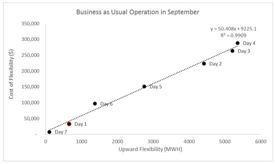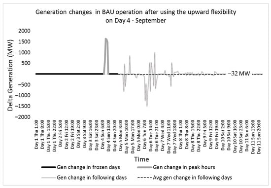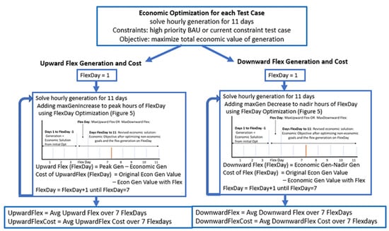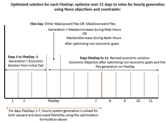 31]. In this power market, the hourly energy sales and purchases for any operating day are committed to the market a day in advance, and these transactions are determined by the economic optimization. The flexibility evaluated on any operating day should, therefore, preserve the economic solutions during the prior days while allowing only the peak or nadir load hours to change during the day being studied for flexibility. The latter consideration is addressed by allowing the later days to change their economic solutions due to flexible operation on the day being studied for flexibility. These changes in later days are included in the total economic value of generation. The flexibility evaluated on each day should incorporate both adjustments: the day exercising flexibility and the later days reacting to those changes.