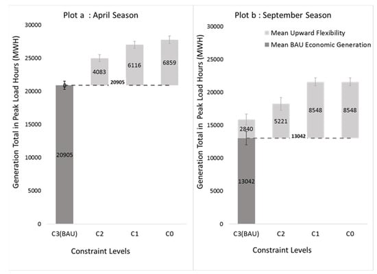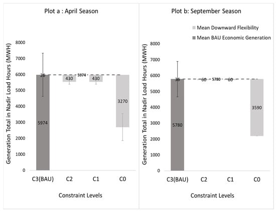 It should be noted that the economic optimization, in many cases, improves in both upward and downward directions in a more relaxed system. This improvement might limit the available flexibility in either direction as the economic solution absorbs most of the additional generation capability. Therefore, to retain the magnitudes of flexibility in less constrained levels that are potentially absorbed by their economic solutions, the maximum or minimum generation capabilities for constraint levels C0, C1 and C2 are compared against the economic solution for the constrained case C3.