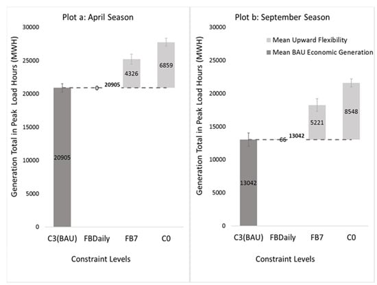 down-flexible solution. The upward flexibility is the increase in energy generated during the peak hours by the up-flexible solution relative to the economic solution. Conversely, the downward flexibility is the decrease in energy generated during the nadir hours by the down-flexible solution relative to the economic solution. Data indicated peak load hours from 8 a.m. to 12 p.m. and nadir load hours from 12 a.m. to 3 a.m. in both seasons.