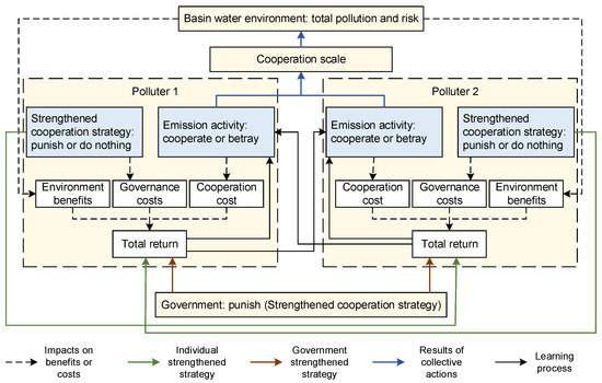 The conceptual model of the new governance system of basin water pollution control under social governance is presented in Figure 1. The basic emission decision function, social learning mechanism, the individual strengthened cooperation strategy, and government intervention are determined based on the conceptual model.
