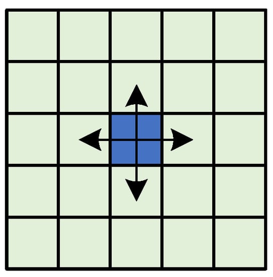 Individual emission activity will affect the local area environment, thus forming feedback into the total revenue return of each emitter in the group. Spatial network structure setting can reflect the influence of local areas, and it is represented by a square grid (Figure 2) in this work. Assuming that in a square grid, there are vertices, and each vertex denotes a group of emitter representatives and each edge stands for the direct interaction between representatives. In such a structure, each representative generally has four neighbors which can interact directly, itself and four neighbors forming a group G, and then a member quantity is five. Except for the group G, emitters are also on the groups constructed by neighbors as the center, so there are total of five Gs. This study also presumes that the acceptable emission amount can be realized by efficiency improvement, without reducing expected output. Then, in a group G, total returns of emitters’ cooperative strategy and betrayal strategy are and , respectively, which can be shown as the below function: