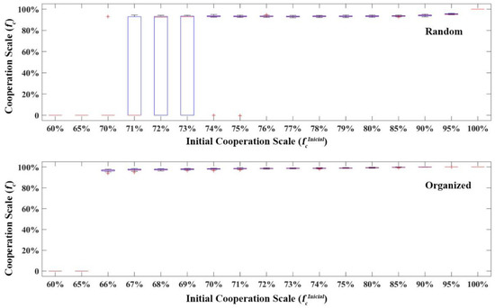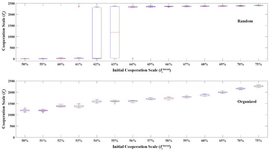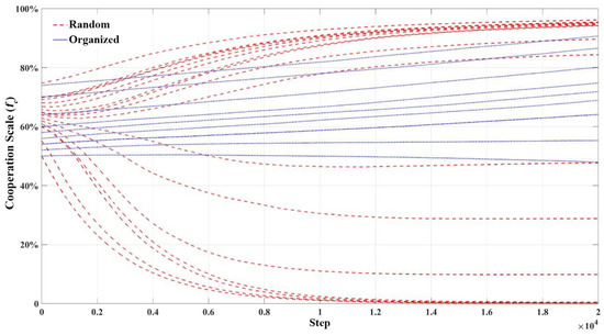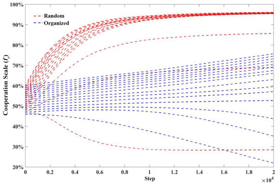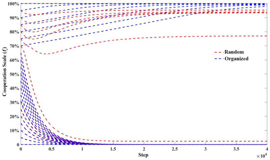 Figure 9 shows more precisely the evolution of cooperation for different initial partner sizes. It can be seen that there is still instability in the random state, but after the individual conflict mechanism is activated, it can achieve high-level cooperation more quickly. The organized state can more easily activate the individual conflict mechanism to achieve the development of collective cooperation, thus avoiding the uncertainty caused by evolutionary instability, though the evolutionary process is longer. Compared to the “binary strategy”, the individual conflict mechanism, whether in a random or organized state, provides more relaxed conditions for collective cooperation, and can realize collective cooperation development with a smaller initial cooperation scale.