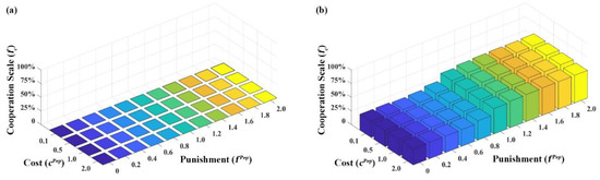 Recent studies have proved that government regulation and punishment play a pivotal role in the cooperative governance of water pollution in basins [55]. Figure 10 shows the average result of the evolutionary cooperator scale based on different cost and punishment combinations under the initial cooperation scale of 50%, to reflect government punishment performance under different implementation conditions.