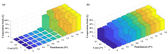 This study firstly examines the conditions for implementing individual conflict strategies. Assuming a random state and an organized state with 50% cooperators, the cooperative evolution results based on different combinations of individual punishment costs and fines are shown in Figure 7a,b, respectively. It can be found from Figure 7a that irrespective of how the costs and fines of individual punishment are combined, the individual conflict mechanism in the random initial state cannot promote collective cooperation. At this point, it can be said that the individual conflict mechanism is completely ineffective. However, Figure 7b provides another result. With the increase in fines, the cooperator proportion after its evolution also gradually increases, so the relationship between fines and cooperator porportion is in positive correlation. When , the collaborator scale is basically maintained. Regarding individual punishment strategy cost, it does not have a significant effect on cooperative evolution. On the whole, the individual conflict mechanism is only maintained under the scale of 50% initial cooperators in the organized state.
