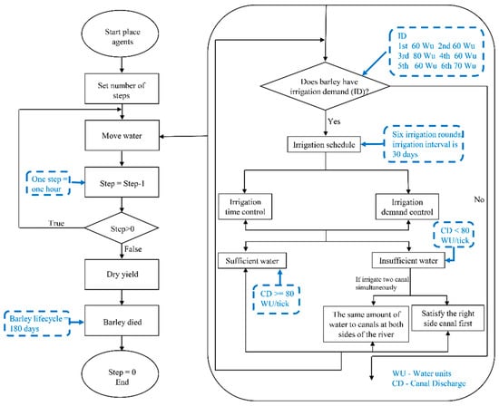 Our Irrigation-Related Agent-Based Model (IRABM) explores the relationships among irrigation-related agents. The Irrigation Management Game (IMG) could provide a very useful foundation for ABM applications, but does not offer, yet, options for realistic water flows and hydraulic infrastructure details [,,]. Our modelling framework was built to represent the realistic operation of an irrigation system, without details of specific hydraulics, but with sufficient hydraulic realism in NetLogo. Typically, ABMs have human agents in a given environment, with water being included as a stock, which is simply described as water demand or supplied water [,,]. In our model, we focus on the non-human agents—the entities that typically constitute “the environment”. In our case, the environment is not static, but produces the way the system functions. Preferences of human agents are expressed through the non-human model agents. Therefore, it is not the relations between water managers and farmers are modelled, but the performance of gates, canals, barley, and farms which represent humans’ actions. Water managers’ actions are represented by the capacity of the head gates and canals, while farmers’ actions are expressed by the capacity of farms’ gate, the amount of received water, and yields of barley. Moreover, we did not define adaptation strategies (yet) in this model. Instead, we study options for adaptation actions in the setting of the scenarios. As such, we designed the model to mimic key activities of an irrigation system (opening and closing gates in the real world), while remaining both concise and meaningful in the model to explore and build the secrets of the real world, especially the effects of opening and closing gates at one location on other locations (compare with Allison et al. [] and Sun et al. []).