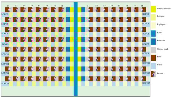 The layout of the artificial irrigation system. Note: RC—the right canal, LC—the left canals, C—canals, F—farmers, number—the ID of each farmer and canal, the higher the number, the more downstream the farmer/canal.
