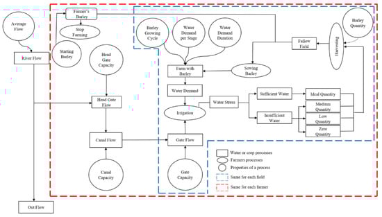 Sensing—The main sensing behaviour in this model is the water flow pattern. Water can only flow from the river to the canal and finally to the farms and try to meet the barley irrigation demand.