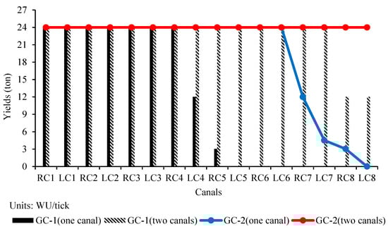 When enough water is available, most farmers and canals gained optimal yields both when irrigating one canal and irrigating two canals simultaneously. Practically all canals gained optimal yields for GCs above 2 WU/tick. However, downstream canals and some middle-stream canals gain lower yields (or even did not have yields) for low GCs of 2 and 1 WU/tick (Figure 4). Irrigating two canals per tick resulted in canals and farmers gaining optimal yields for all GCs, except for GC = 1 WU/tick—with the farmers along the last two canals gaining half of the optimal yield (1.5 ton). When only one canal is irrigated, middle stream canals also start to be affected by the relatively low GC. Some farmers cannot even survive—as no yields at all.