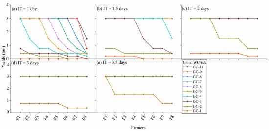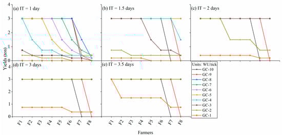 Yields per farmer with sufficient water under Time Control with different irrigation times: (a) Farmers’ yields when IT = 1 day; (b) Farmers’ yields when IT = 1.5 days; (c) Farmers’ yields when IT = 2 days; (d) Farmers’ yields when IT = 3 days; (e) Farmers’ yields when IT = 3.5 days.