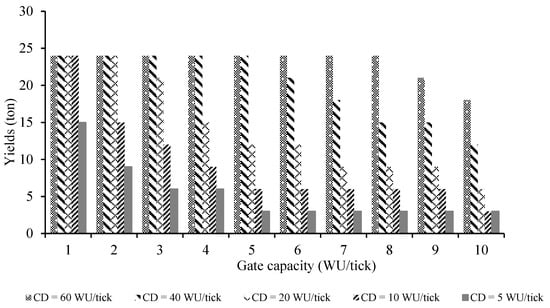 There is no difference in yields in the system under DC when irrigating two canals simultaneously or one canal at the time for higher gate capacities. Apparently, the available RD can be transferred to all canals and farms. There is a difference, however, between canals, with downstream canals gaining lower yields, and, occasionally, even no yields at all—with lower GCs of 1 and 2 WU/tick, when most of the upstream canals still gained the optimal yields. Comparing irrigating two canals and one canal per tick, the former one results in higher and more constant yields for farmers located in the middle-stream and downstream canals for GC at 1 and 2 WU/tick. No matter how many canals are irrigated at the same time, there is almost no difference in yields among farmers located along the same canal.