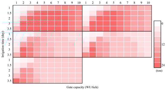 An irrigation schedule is important to link irrigation-water management to (improvement of) crop productivity. A relatively simple calculation method [] was applied, linking the depth of irrigation application and the calculated irrigation water need (IN) of barley over the growing season (Appendix B). Based on the calculation, we defined six irrigation applications (irrigation rounds) over one complete barley growth period—180 days, with an irrigation interval of 30 days. We also calculate the irrigation demand at each application as 60 WU, 60 WU, 80 WU, 60 WU, 60 WU, and 70 WU, respectively. The irrigation schedule represents farmers decisions when to open and close their gates according to their irrigation requests. The irrigation time per farm will impact barley yields on the farm, as irrigation time is directly linked to the water volume that crops receive. The same time may influence other farms, when bringing water to one farm lowers the available time for other farms. With our 30 days irrigation period, 1.5 days of irrigation time per canal is a realistic maximum time to irrigate one canal without disturbing others, when all 16 canals are to be irrigated one after the other. In the model, irrigation time IT is set at 1 day, 1.5, 2, 3, and 3.5 days, respectively, when irrigating two canals per tick.
