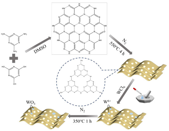 The MCA-CN/WO3 catalysts were fabricated by the following steps. Typically, 250 mg MCA-CN and a certain amount of WCl6 were ground with a small amount of ethanol until the materials turned blue. The blue materials were calcined at a certain temperature in N2 atmosphere for 1 h to construct a heterojunction (heating rate of 7 °C·min−1) [16]. To optimize the WO3 content, MCA-CN/WO3 samples with various WO3 contents (5 wt%, 15 wt%, 25 wt% and 35 wt%) were prepared. Samples 300 °C MCA-CN/WO3, 350 °C MCA-CN/WO3, 400 °C MCA-CN/WO3 and 450 °C MCA-CN/WO3 were obtained when the thermal treatment temperatures were 300 °C, 350 °C, 400 °C and 450 °C, respectively. For comparison, pure WO3 was synthesized without MCA-CN in the same way, and single MCA-CN was second calcined at 350 °C for 1 h without WCl6. The typical synthetic procedure is shown in Figure 1.