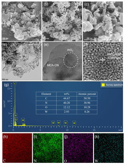SEM images of (a) bulk CN; (b) MCA-CN and (c) MCA-CN/WO3. (d–f) TEM images of MCA-CN/WO3; (g) survey spectrum of MCA-CN/WO3 and (h–k) EDX spectrum and elemental mapping images of MCA-CN/WO3.