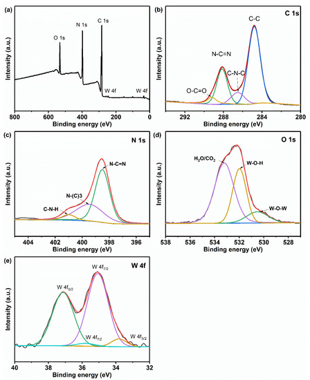 XPS spectra of MCA-CN/WO3. (a) Survey spectrum. (b) C1s and (c) N1s spectra of MCA-CN/WO3. (d) O1s and (e) W 4f spectra of MCA-CN/WO3.