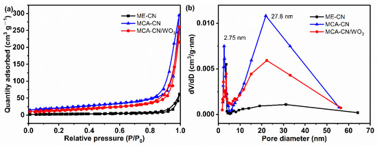 The N2 adsorption−desorption isotherms and the Barrett–Joyner–Halenda (BJH) pore size distribution curves of ME-CN, MCA-CN and MCA-CN/WO3 are displayed in Figure 5. In N2 adsorption−desorption isotherms, all samples showed type IV isotherms with a type H3 hysteresis loop, indicating the presence of mesoporous structures (Figure 5a). As shown in BJH pore size distribution curves (Figure 5b), all samples exhibited a wide range distribution of pore size. There were two peaks at 2.75 nm and 27.8 nm in in the curve of MCA-CN, indicating that the pore size distributed from 2 nm to 30 nm. The BET specific surface area, pore volume and pore size of the materials were calculated by the BJH method and are listed in Table 1. The BET specific surface areas of ME-CN, MCA-CN and MCA-CN/WO3 composites were calculated to be 10.4, 74.4 and 53.8 m2 g−1. The specific surface area of MCA-CN is 7.1 times higher than that of ME-CN. Obviously, the increased surface area and mesopores of carbon nitride are attributed to the addition of cyanic acid, providing more active sites for catalytic degradation of pollutants. In addition, the porous structure also contributes to enhanced light absorption, since light is reflected multiple times within the holes. However, MCA-CN/WO3 had a lower surface area than MCA-CN, because WO3 is coarse and lumpy with a small specific surface area, and the load of WO3 covered part of the pores of MCA-CN.