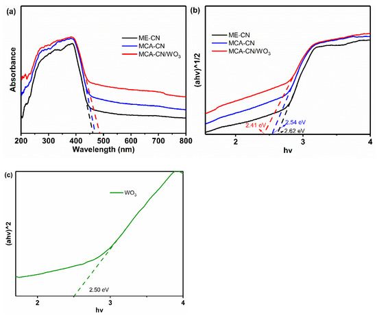 (a) DRS of MCA-CN/WO3, ME-CN/WO3 and MCA-CN/WO3; (b) corresponding plots of the transformed Kubelka−Munk function; (c) plots of the transformed Kubelka−Munk function.