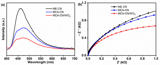 (a) PL spectra and (b) EIS Nyquist plots of ME-CN, MCA-CN and MCA-CN/WO3.