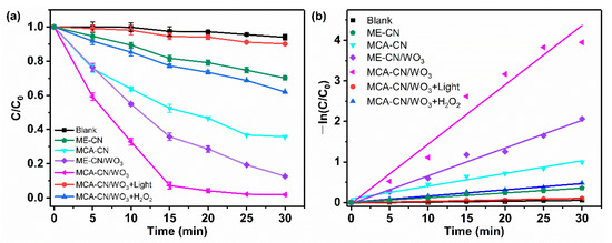 The catalytic activities of MCA-CN/WO3 composites were examined by degrading MB in the presence of H2O2 and visible light. As exhibited in Figure 8a, there was little MB degraded in photo-Fenton system without catalysts, indicating the negligible radical production by H2O2 without catalysts. After adding MCA-CN/WO3 catalysts, the removal rate of MB reached 98% within 30 min. This result suggested that MCA-CN/WO3 composites were highly efficient catalysts for H2O2 activation to produce reactive radicals. The MB degradation efficiency of MCA-CN (63%) was higher than that of ME-CN (30%), which ascribed to the larger specific surface area of MCA-CN. MCA-CN/WO3 exhibited better catalytic performance than MCA-CN, suggesting that the heterojunction between MCA-CN and WO3 accelerated the decomposition of H2O2 for improving catalytic activity. The MB degradation efficiency of ME-CN/WO3 (87%) was lower than that of MCA-CN/WO3, indicating that the sheet-like structure of MCA-CN can enhance catalytic performance. Moreover, in the MCA-CN/WO3 photo-Fenton-like process, the degradation rate was higher than when H2O2 (38%) and light (10%) were present alone. This result indicated that the synergistic effect of catalysts, H2O2 and visible light could significantly enhance the removal efficiency of MB. Figure 8b displays the reaction rate constants (k) obtained through the Langmuir–Hinshelwood kinetics model. Among all the materials, the rate constant of MCA-CN/WO3 (0.1465 min−1) was the highest, which was about 12.4, 4.7 and 2.1 times higher than that of ME-CN (0.0118 min−1), MCA-CN (0.0314 min−1) and ME-CN/WO3 (0.0685 min−1). Furthermore, the kinetic constant of MCA-CN/WO3 in the photo-Fenton-like process was 37.5, 9.5 times higher than its rate constant in the corresponding photocatalytic processes (0.0037 min−1) and Fenton-like processes (0.0154 min−1). The photo-Fenton degradation of pollutants over g-C3N4-based photocatalysts is shown in Table S1, and MCA-CN/WO3 displayed better degradation performance than most of those catalysts.