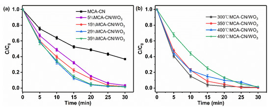 To obtain optimized preparation conditions for high-performance MCA-CN/WO3, two experimental parameters were adjusted, the loading amount of WO3 and the heat treatment temperature. As exhibited in Figure 9a, the removal rate of MB increased gradually as the WO3 content increased from 5% to 25%. When the content of WO3 was 35%, there was little improvement in the degradation efficiency. Excess WO3 induced inter-particle aggregation, thus decreased interfacial contact with MCA-CN and lowered photocatalytic performances. Therefore, the optimal content of WO3 in the composite was 25%. The degradation properties of catalysts synthesized at temperatures from 300 °C to 450 °C are shown in Figure 9b. Obviously, catalysts synthesized at 300 °C and 350 °C showed better catalytic performance than that at 400 °C and 450 °C. Furthermore, the catalysts synthesized at 300 °C, 350 °C and 450 °C were characterized by XRD (Figure S2). There were no obvious diffraction peaks of WO3 in the curve of 300 °C MCA-CN/WO3, indicating that WO3 cannot be formed at 300 °C, while there were impure peaks in the curve of 450 °C MCA-CN/WO3, owing to the decomposition of MCA-CN. Hence, 350 °C was the most appropriate temperature to synthesize the sample with good catalytic performance.