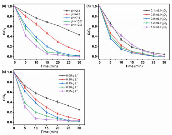 The effects of pH, amounts of H2O2 and catalyst (25% MCA-CN/WO3) on the removal efficiency of MB in the photo-Fenton system were explored to optimize the reaction conditions. It is obvious from Figure 10a that the sample maintained excellent degradation performance in the pH range of 4.3 to 12.3. In addition, the higher the pH value, the better the degradation of MB. About 57% of MB was degraded in 30 min at pH 2.4, but when increasing the pH value to 12.3, the degradation rate reached 99.5% in 30 min. Under acidic conditions, high concentrations of H+ will scavenge HO2• (HO2• + H+ + e− → H2O2) [30], while high pH is beneficial to the survival of HO2• and lowers the redox potential of the conduction band to form more HO2•. Since 1O2 formed via HO2•was responsible for the removal of MB, there was more 1O2 produced at a higher pH, improving the MB degradation efficiency.