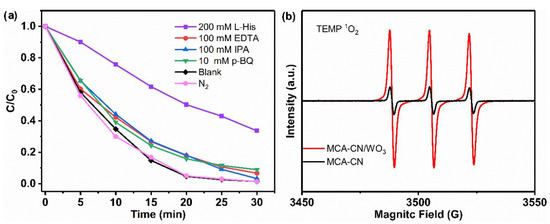 In radical quenching tests, IPA, p-BQ, EDTA-2Na and L-His were used to eliminate •OH, •O2−, h+ and 1O2, respectively. As exhibited in Figure 11a, the degradation rate of MB decreased slightly when IPA, EDTA-2Na and p-BQ were added into the system. However, the degradation of MB decreased from 98% to 40% within 30 min after the adding of L-His. The results indicated that 1O2 radicals were responsible for MB removal in the photo-Fenton system of the MCA-CN/WO3 composite, while •OH, •O2− and h+ had a slight effect on MB degradation.