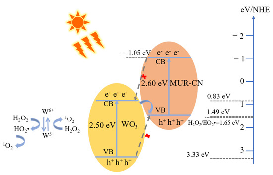 The energy band structures of MCA-CN/WO3 obtained by UV-Vis DRS are shown in Figure 12. For such an energy band structure, there are usually two possible charge transfer mechanisms: (1) type II heterojunctions and (2) Z-scheme heterojunctions [38]. Supposing there is a type II heterojunction between MCA-CN and WO3, photogenerated holes are transferred from the VB of WO3 to the VB of MCA-CN, while photogenerated electrons are transferred from the CB of MCA-CN to the CB of WO3 with a positive potential (grey dashed line in Figure 12). However, due to the lower reduction potential of H2O2/HO2• (E0 = 1.65 V. NHE) than the VB potentials of MCA-CN (1.49 eV) [39], the holes on the VB of MCA-CN cannot decompose H2O2 into HO2•. This is not consistent with the above conclusion that 1O2 is produced by HO2•. For a Z-scheme heterojunction, the electrons on the CB of WO3 are transferred to the VB of MCA-CN (solid blue line in Figure 12), and the VB potential of WO3 (3.12 eV) is lower than H2O2/HO2• (E0 = 1.65 V. NHE), allowing the production of HO2•. The above analysis suggested that the charge transfer mechanism of MCA-CN/WO3 was Z-scheme.