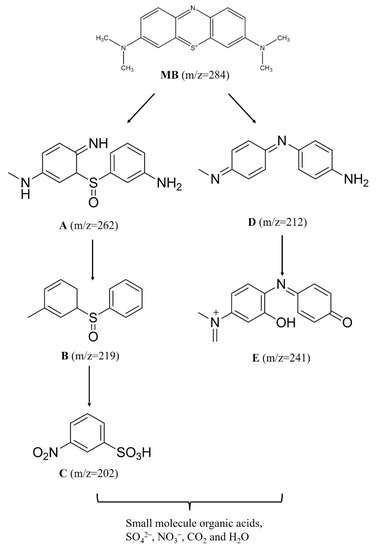 To investigate the degradation pathways of MB in the photo-Fenton-like process, the intermediate products at 30 min of the reaction were determined using LC-MS. The structures of the intermediates were obtained through the Nist standard database and are listed in Table S2 (Supplementary Materials) and Figure S3 (Supplementary Materials), showing the mass spectrum of intermediates. Degradation pathways are shown in Figure 13. Among the molecules of MB, the C-S molecular bond has the smallest bond energy and is easy to break. The N of the C-N bond is also susceptible to be oxidated because of its low electronegativity. Under the attack of 1O2, the bond between the methyl group and C was cracked. In pathway 1, the MB was changed into intermediate A when S was oxidized to S=O. The intermediate A was transformed to intermediate B when the C-N bonds broke. Then, the C-S bond broke and intermediate B was transformed to intermediate C. In pathway 2, the MB was changed into intermediate D owing to the cracking of C-S bonds. With the strong oxidation capacity of 1O2 and •OH, intermediate D is oxidized to form intermediate E. As the reaction continued, intermediate C and intermediate E would decompose into small molecule organic acids, SO42−, NO3−, CO2 and H2O.