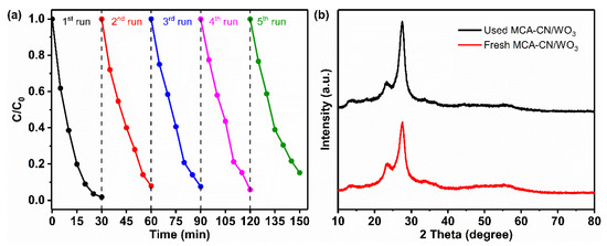 The stability of a catalyst is one of the most important indexes of its practicability. A cycling experiment was conducted to evaluate the reusability of MCA-CN/WO3. As shown in Figure 14a, even after five cycles, the MCA-CN/WO3 catalyst exhibited high catalytic performance, degrading 85% of the MB in 30 min. The XRD spectra of the five cycles of MCA-CN/WO3 used were carried out (Figure 14b). Compared with the XRD patterns of the fresh MCA-CN/WO3 catalyst, the diffraction peak of MCA-CN/WO3 after five cycles did not change greatly, indicating the good stability and reusability of the MCA-CN/WO3 catalyst.