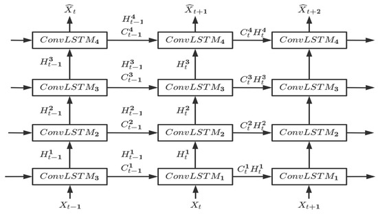 Multiple ConvLSTMs can be stacked and temporally concatenated to form more complex structures. Such models have been applied to solve many real-world spatiotemporal prediction problems. The four-layer stacked structure is generally used when using the ConvLSTM for spatiotemporal prediction. At each timestep, the input information will be transformed by four ConvLSTM units, and the last ConvLSTM unit outputs the expected prediction. Here, the first two ConvLSTM units are generally understood as the Encoder part of the convolutional neural network, and the last two ConvLSTM units are understood as the Decoder part of the convolutional neural network. Each ConvLSTM unit has its memory, which independently stores historical state information, and each ConvLSTM unit only obtains historical state information from the ConvLSTM unit of the same layer at the previous moment. Intuitively, this method of obtaining historical state information is passive to a certain extent, and fails to give full play to the active role of current input information in controlling the transfer of historical state information. Figure 1 shows the stacked architecture of the ConvLSTM network used for spatiotemporal prediction.