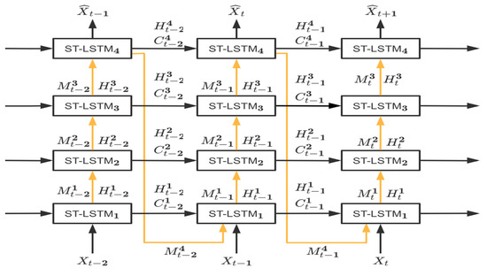 Compared with the ConvLSTM model [10], the biggest difference between the PredRNN model [35] is that the spatial memory unit is added to the PredRNN model. The proponents of the PredRNN model believe that each ConvLSTM unit of the ConvLSTM model only stores the memory state of the layer in the time dimension, and there is a lack of memory state transfer between the ConvLSTM units of each layer at the same time. This structure leads to a ConvLSTM model that can handle the dynamic information of spatiotemporal processes with time, but not the changes in the spatial details. In the ST-LSMT unit, a new spatial memory structure is added, combined with the original temporal memory structure in the ConvLSTM unit, to generate a new hidden state . However, the spatial and temporal memory structures save and update their respective historical state information independently of each other. The newly added spatial memory structure mainly stores the spatial variations of the spatiotemporal process. It improves the memory flow by employing the zigzag path for better knowledge transfer, as the yellow line depicted in Figure 2. The architecture of the stacked recurrent neural network of the PredRNN model is shown in Figure 2.