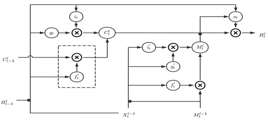 where denotes the sigmoid function; denotes the convolution operator; denotes the Hadamard product; and [ ] denotes the concatenation operator. , , , and denote the memory’s state variations, input gate, forget gate, and output gate, respectively. denotes the temporal memory unit, denotes the spatial memory unit. The final output gate is controlled by the current input , the hidden state , the updated time state , and the updated space state . The final hidden state is the synthesis of the updated time state and the updated space state .