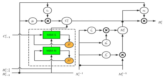 To address the loss of detailed information in the RNN model when modeling the spatiotemporal processes, Shi et al. [10] combined the advantages of the convolution operation and LSTM. They proposed the convolutional neural network ConvLSTM that used convolution instead of the original matrix multiplication operation, allowing LSTM to maintain the two-dimensional characteristics of the image. Shi et al. [31] also combined the convolution operation with the GRU model [32,33], and proposed the Trajectory GRU (TrajGRU) model, which can actively learn the position-changing structure of the recurrent connections. Wang et al. [34] proposed an Eidetic 3D LSTM (E3D-LSTM), which integrated 3D convolution into RNN, and the encapsulated 3D-Conv enabled the local perceptron of RNN to have motion-sensing capability and enabled the memory cells to store better short-term features. Wang et al. [35,36] proposed a PredRNN model using zigzag memory flow, the core of which is a new spatiotemporal LSTM (ST-LSTM) unit, which can simultaneously extract and memorize variations on both the temporal and spatial dimensions. Wang et al. [37] proposed a Memory In Memory (MIM) network and a corresponding recurrent block. The MIM module uses the differential signal between the adjacent cyclic states to simulate the non-stationary and nearly stationary characteristics of the spatiotemporal dynamics of two cascaded, self-updated memory modules. The above method combines convolution with RNN, extracts the information in both time and space dimensions, and significantly improves the prediction tasks for many of the natural spatiotemporal processes. However, when the cell blocks of these networks are in the state of transition, the historical state information they rely on is only from the previous moment. This dependence is based on the assumption that the described spatiotemporal process is an approximate first-order Markov process, or is transformed into a first-order Markov process by some transformation. However, in fact, the natural spatiotemporal process is often non-stationary and highly nonlinear.