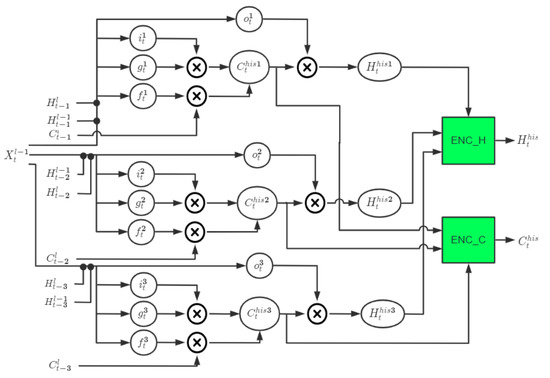 In Figure 6, the black dot denotes the concatenation operator. Combined with the selection mechanism of the LSTM structure, is used as the active variable, the state variables and at time t−1 are actively selectively extracted to obtain and , the state variables and at time t−2 are actively selectively extracted to obtain and , and the state variables and at time t−3 are actively selectively extracted to obtain and . Then, use the convolutional network ENC_H to synthesize the hidden state information , , and , ENC_C to synthesize the state information , , and . Automatically assign the attention weights to the state information at each moment to generate the weighted state information and of gated attention. The internal state transition equation of the LSTM-Atten module is written as: