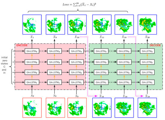 As shown in Figure 8, we adopted a stacked recurrent neural network structure, which contains four-layer GA-LSTM units, and the number of feature channels of each gated structure in each GA-LSTM unit was 64. The model was trained with Mean Squared Error (MSE) as the loss function, using the Ranger optimizer, and the initial learning rate was set to 0.005. We set the mini-batch to eight, used the data-parallel mode for training, and set the time length to 3, extracting the historical state information of interest from the last 3 past moments each time. Additionally, we applied the layer normalization operation after the convolution of each gating operation of this model to reduce the covariate shift problem.