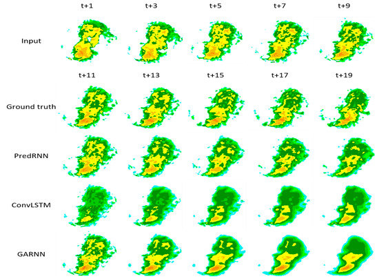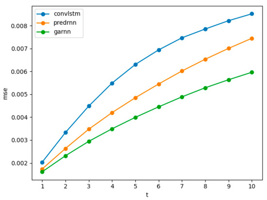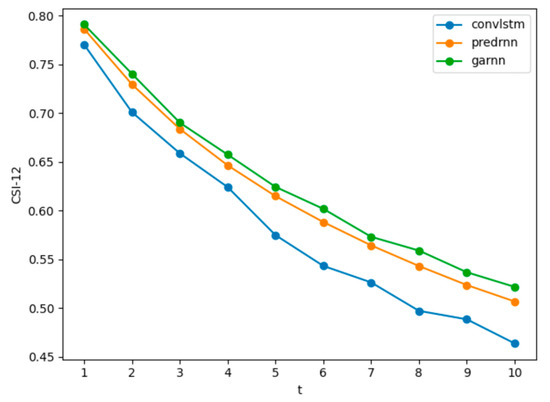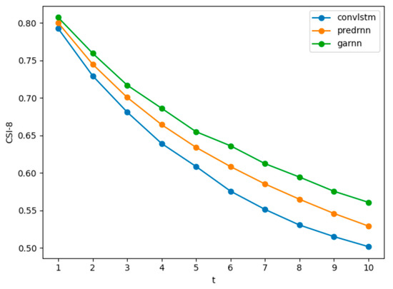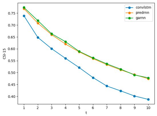 As shown in Figure 10, the further the PredRNN model predicts, the greater the growth trend of MSE than the GARNN model. We speculate that the predictions of the PredRNN model are clearer than the GARNN model in the future, however, such clear details are not correct details, so the loss is too large, and the loss growth rate is hardly weakened. The GARNN model is relatively fuzzier, especially for the later predictions, and because it has learned the overall time dimension change characteristics, the overall MSE loss is smaller, and the loss growth rate is also lower. This can also be seen from the evaluation based on the CSI.