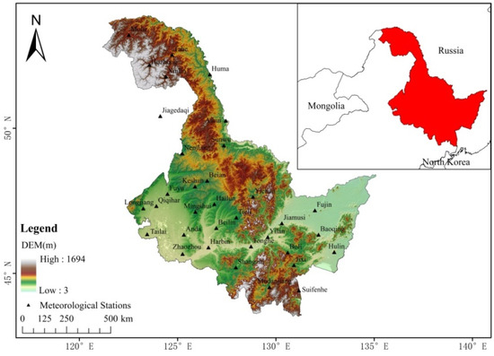 Heilongjiang Province is located in northeastern China, at the southern edge of the permafrost zone in eastern Eurasia [43], between 121°11′ E–135°05′ E and 43°26′ N–53°33′ N (Figure 1). The area is 473,000 km2 (including the Jiagedaqi and Songling districts), with Russia to the north and east, Inner Mongolia to the west, and Jilin Province to the south. The terrain is roughly high in the northwest, north, and southeast and low in the northeast and southwest, consisting of mountains, terraces, plains, and water; it spans four major water systems: the Heilongjiang River, the Ussuri River, the Songhua River, and the Suifen River. The area has a cold temperate and temperate continental monsoon climate, and the main characteristics of the climate are low temperatures and aridity in spring, warm and rainy weather in summer, easy flooding and early frost in autumn, a cold and long winter, a short frost-free period, and large regional differences in climate [44]. It is also one of the largest forestry provinces in China [45,46] and one of the important grain-producing areas, among the highest grain-yielding provinces in China [47]. Meanwhile, Heilongjiang Province is also where high-latitude frozen ground can be found in China [48,49].