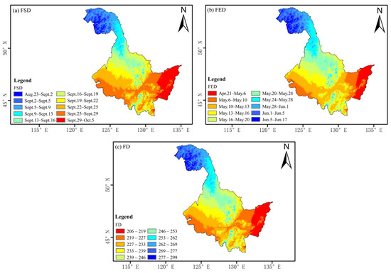 Spatial distribution of FSD (a), FED (b) and FD (c) of the soil freeze–thaw processes in Heilongjiang Province from 1971 to 2020.
