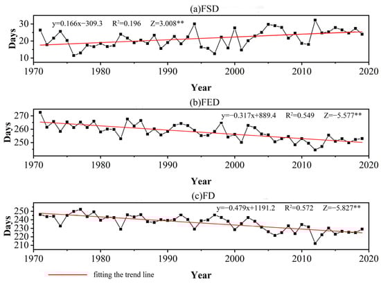 Interannual variation in FSD (a), FED (b) and FD (c) of the soil freeze–thaw processes in Heilongjiang Province (** indicates reaching the significance level of α = 0.01).