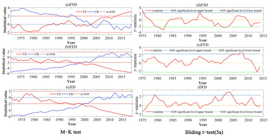 The key variables of the soil freezing and thawing process in Heilongjiang Province were averaged across the overall area to determine their interannual variation, as shown in Figure 3. From 1971 to 2019, the three key variables of the soil freezing and thawing process in Heilongjiang Province showed significant trends with time. The earliest FSD was 18 August 1976, and the latest was 27 October 2016, with the average FSD around 21 September. The earliest last freezing date was 12 April 2016, and the latest was 28 June 1987, with the average freeze end date around 15 May. The average FD in Heilongjiang Province from 1971 to 2019 was 232.6 d. During the entire study period, the FSD was delayed by 8.1 d at a rate of 1.66 d/10 a, the FED advanced by 15.5 d at a rate of 3.17 d/10 a, and the FD was reduced by 23.6 d at a rate of 4.79 d/10 a. We used the M–K mutation test and the sliding t-test method to identify abrupt changes in key variables of the soil freeze–thaw process from 1971 to 2019, as shown in Figure 4. The annual trends of key variables were the same as above, and the results of the M–K test show that there was a sudden change in the FSD in 2002, as shown in Figure 4a; meanwhile, there was no sudden change in the FED and FD, as shown in Figure 4b–f. The mutation point of the FSD was tested by different steps of the sliding t-test method, but the mutation point did not pass the significance test of α = 0.05, as shown in Figure 4b, indicating it was a spurious mutation point. From the results of the M–K test and sliding t co-test, it was concluded that the trends of delayed FSD, early FSD, and a decrease in FD changed significantly from 1971 to 2019. This is consistent with the trends of permafrost changes in other regions [60,61].