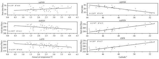 To further explore the influence of soil freeze–thaw-related factors and the climate on the soil freeze–thaw process in Heilongjiang Province, the correlations between key variables and the annual mean temperature and latitude were analyzed (Figure 5). To ensure the consistency between the changes to the soil freeze–thaw process and the changes in temperature, the annual mean temperature statistical period was from September to August of the following year. The results show that the soil freeze–thaw process in Heilongjiang Province was closely related to temperature and latitude. The correlations of the three key variables of the freeze–thaw process with the annual mean air temperature and latitude passed the 95% significance test; there were significant correlations with air temperature and latitude. The FSD was positively correlated with the annual mean temperature, and the FED and FD were negatively correlated with the annual mean temperature. Latitude is an important factor in determining the vertical distribution of mean temperature from north to south, which further determines the variation in the soil freezing and thawing process. In Heilongjiang Province, for each 1° increase in latitude, the FSD was 2.6 d earlier, the FED was 2.8 d later, and the FD was 5.4 d later. This was consistent with previous findings that permafrost changes in northeast China have a significant latitudinal effect [39], but the trends in the key variables differed. We propose that the main reason for this is that there are differences in the selection of meteorological stations, as well as the factors for judging the soil freezing and thawing thresholds.