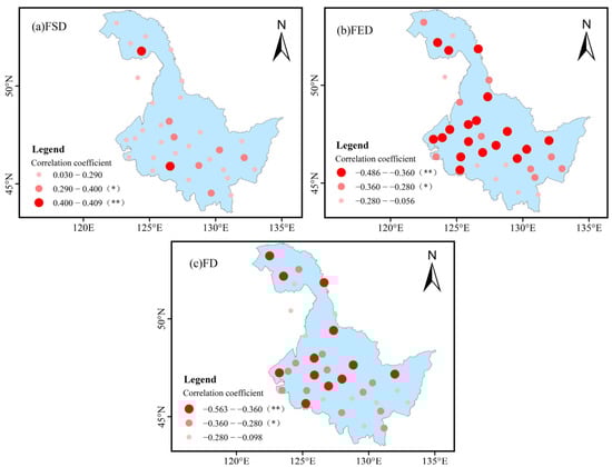 Figure 6 shows the spatial distribution of the correlation coefficients between the key variables and the annual mean temperature for the soil freeze–thaw process at each site. The absolute values of the correlation coefficients between the key variables and the mean annual temperature ranged from 0.03 to 0.6, indicating that the key variables had a relatively significant correlation with the mean annual temperature. The proportions of stations passing the 0.05 significance test were 23.5, 47.1, and 64.7%, all concentrated in the southern region; the change in the annual mean temperature had the most significant effect on the FSD and the least effect on the FED; the FSD was positively correlated with the annual mean temperature, and the FED and the FD were negatively correlated with the annual mean temperature. The reason for this phenomenon is mainly the different bases for judging the FSD in terms of the freezing and thawing thresholds of soil, which can be difficult to determine, given that soils in SFG areas experience repeated freezing and thawing cycles during freezing [51,52].