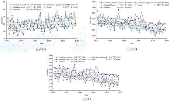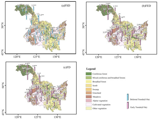 Figure 7a shows the trend of FSD under different vegetation cover types in Heilongjiang Province, which was significantly delayed (α = 0.01) under five vegetation types. During the study period, the FD was delayed by 7.15, 8.23, 9.65, 7.11, and 8.67 d for coniferous forest, broadleaf forest, meadow, scrub, and cultivated vegetation, respectively, with the least change in scrub and the greatest in meadows. As shown in Figure 7b,c, FED and FD varied significantly (α = 0.01) under all five vegetation types, with the FED 12.94, 16.07, 16.86, 13.23, and 15.83 d earlier, and the FD 19.6, 24.3, 26.51, 20.58, and 24.5 d shorter, respectively. Compared to coniferous forest and scrub, the trend of advancement was more obvious in broadleaf forest, meadow, and cultivated vegetation. Figure 8 shows the spatial distribution of key variables of the soil freezing and thawing process under different vegetation cover types. Most of the stations passed the significance test of 0.05; only the trends of the three key variables at Mohe station were not obvious and failed to pass the significance test. Under the same vegetation type, the variation in the FSD showed a trend where the lower the latitude, the more obvious the delay; the FED and the FD showed a trend where the lower the latitude, the more obvious the variation. Due to the latitudinal differences in vegetation distribution, the trends in the key variables of the freeze–thaw process also showed differences under the same vegetation type. Meanwhile, in the Songnen Plain and Sanjiang Plain, due to the low altitude, the change trends of the three key variables were all more significant than those in the northern and central mountainous areas. The main reason for these changes is that the vegetation layer has heat insulation, wind and snow blocking, and root water absorption properties [62,63], which can prevent cold airflow from entering the soil and impede soil heat dissipation during the cold season, delaying soil freezing [64,65,66]; in the warm season when the temperature rises, the vegetation reflects a lot of solar radiation, and the melting of snow and ice in the upper part of the soil layer in the forest consumes a lot of heat energy and hinders soil melting [67]. At the same time, the insulation effect and the weakening effect on solar radiation are obvious in coniferous forests compared to broadleaf forests, meadows, and cultivated vegetation due to the tall trees and the high-level structure of coniferous forests, along with thickets’ heavy branches and high vegetation cover [68].