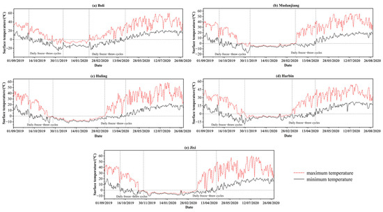 To further explore the influence of different vegetation types on the surface temperature during the freeze–thaw process of the soil, five stations with similar latitudes and located in five different vegetation types were selected as representative stations to analyze the changes in the surface temperature during the freeze–thaw cycle. Considering the continuity and accuracy of the station data, the daily surface maximum and minimum temperatures for a complete freeze–thaw cycle year from 1 September 2019 to 31 August 2020 were selected and their variation curves were plotted, as shown in Figure 9.