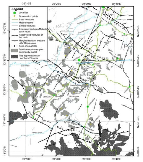 - Hagos, M.; Gebreyohannes, T.; Amare, K.; Hussien, A.; Berhane, G.; Walraevens, K.; Koeberl, C.; van Wyk de Vries, B.; Cavalazzi, B. Tectonic Link between the Neoproterozoic Dextral Shear Fabrics and Cenozoic Extension Structures of the Mekelle Basin, Northern Ethiopia. Int. J. Earth Sci. 2020, 109, 1957–1974. [Google Scholar] [CrossRef]