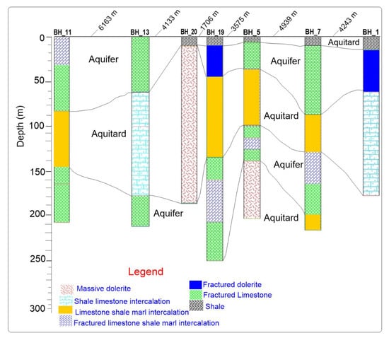 The hydrogeological setting of the area is quite complex, due to the presence of different water-bearing geological formations and associated dolerite intrusions, as well as geological structures. Fractured dolerite rock units can serve as an aquifer in the Mekelle area, but when the dolerites are massive, they could act as aquicludes [49]. Depending on the vertical and lateral extent of the geological structures, the fractured zones have a direct relation with water percolation from surface to groundwater [15]. The dolerites are mainly fractured at their contact zones with the limestone into which they have intruded, resulting in the fracturing and assimilation of the limestone. The cooling of the dolerites occurred quickly in these contact zones, leading to fracturing. These contact zones are particularly water-bearing [50,51]. Based on borehole logs data, geological field mapping, and a review of hydrogeological investigation works, fractured limestone, fractured dolerite, and fractured limestone-shale-marl intercalation rock units are the main identified aquifer types in the study area [15,19,46,48,49,52].