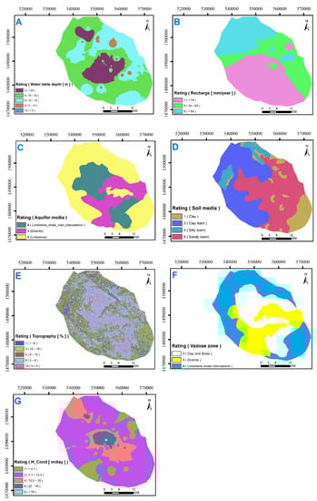 The seven input thematic layers of the DRASTIC model and their ratings for the study area: (A) depth-to-water table; (B) net recharge; (C) aquifer media; (D) soil media; (E) topography; (F) vadose zone; and (G) hydraulic conductivity.