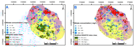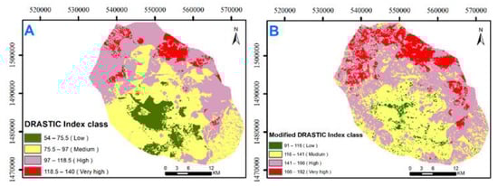 Vulnerability index maps of the study area using the DRASTIC (A), and the modified DRASTIC (B) methods.