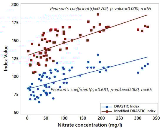 Validation is very important in preventing a researcher from drawing erroneous conclusions and making subjective assessments [68]. The presence of nitrate concentration in elevated concentrations in groundwater is not natural. Therefore, nitrate is an important indicator of pollution distribution, as well as movement [69]. Nitrate concentration data are very helpful in generating a validation model for DRASTIC vulnerability mapping [30,70,71,72]. In this research, 65 groundwater samples with a range of nitrate concentrations were collected from Mekelle University and the Tigray Water Resource Bureau. We used these data to validate both the DRASTIC and modified DRASTIC models.