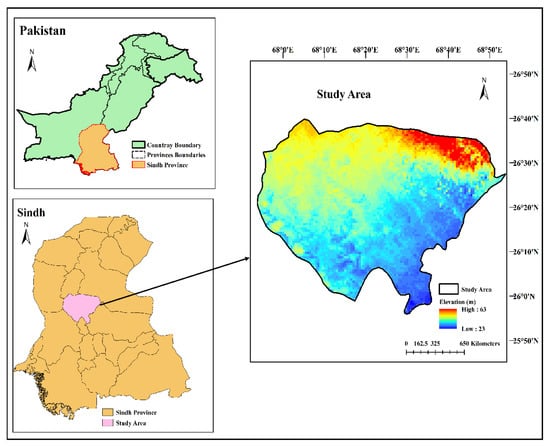 The study area selected for the present study is the Shaheed Benazirabad district, established by the British government, with a latitude of 26°5′53.99″ N and a longitude of 68°24′34.38″ E. It is also called the Shaheed Benazir Abad district, as presented in Figure 1. Geographically, it is the center of the Sindh province of Pakistan, with an area of 4239 square km and a population of 1,435,130. It is situated 50 km from the left bank of the River Indus. The geographical location of the city makes it a major railway and roadway transportation hub in the province. As a nationwide hub of cotton manufacture and one of the largest producers of bananas in Pakistan, it is also famous for its sugarcane, mango, etc. Climatically, the Shaheed Benazirabad district falls in the arid and semi-arid regions, with a maximum temperature of 52 °C []. From a hydrological perspective, the study area belongs to the arid and semi-arid region type, with an average precipitation of more than 100 mm. The quality of underground water is brackish and saline.