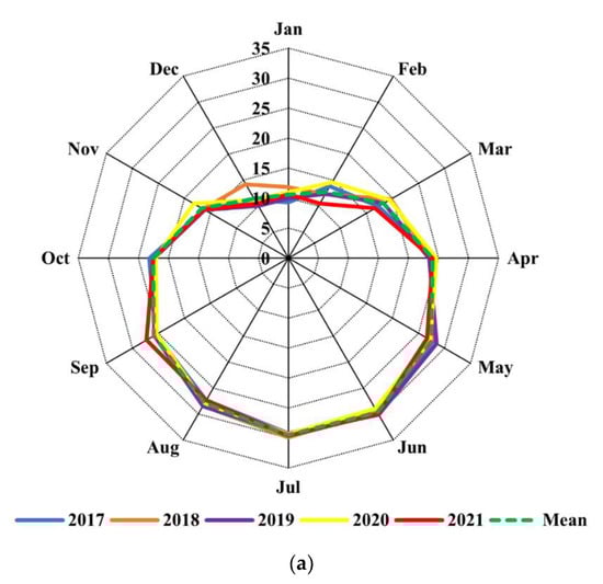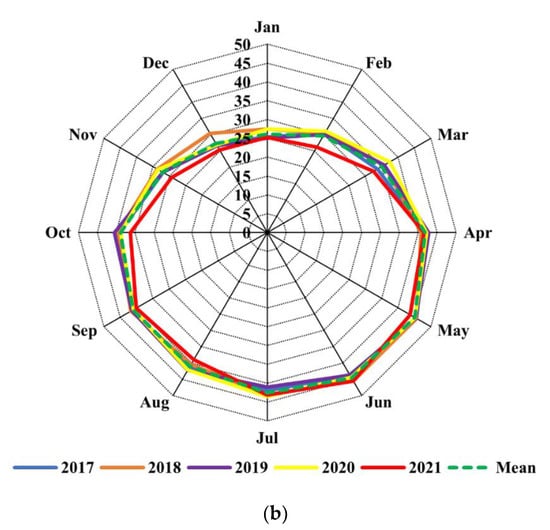(a) Minimum and (b) maximum temperatures from 2017 to 2021 in the study area.